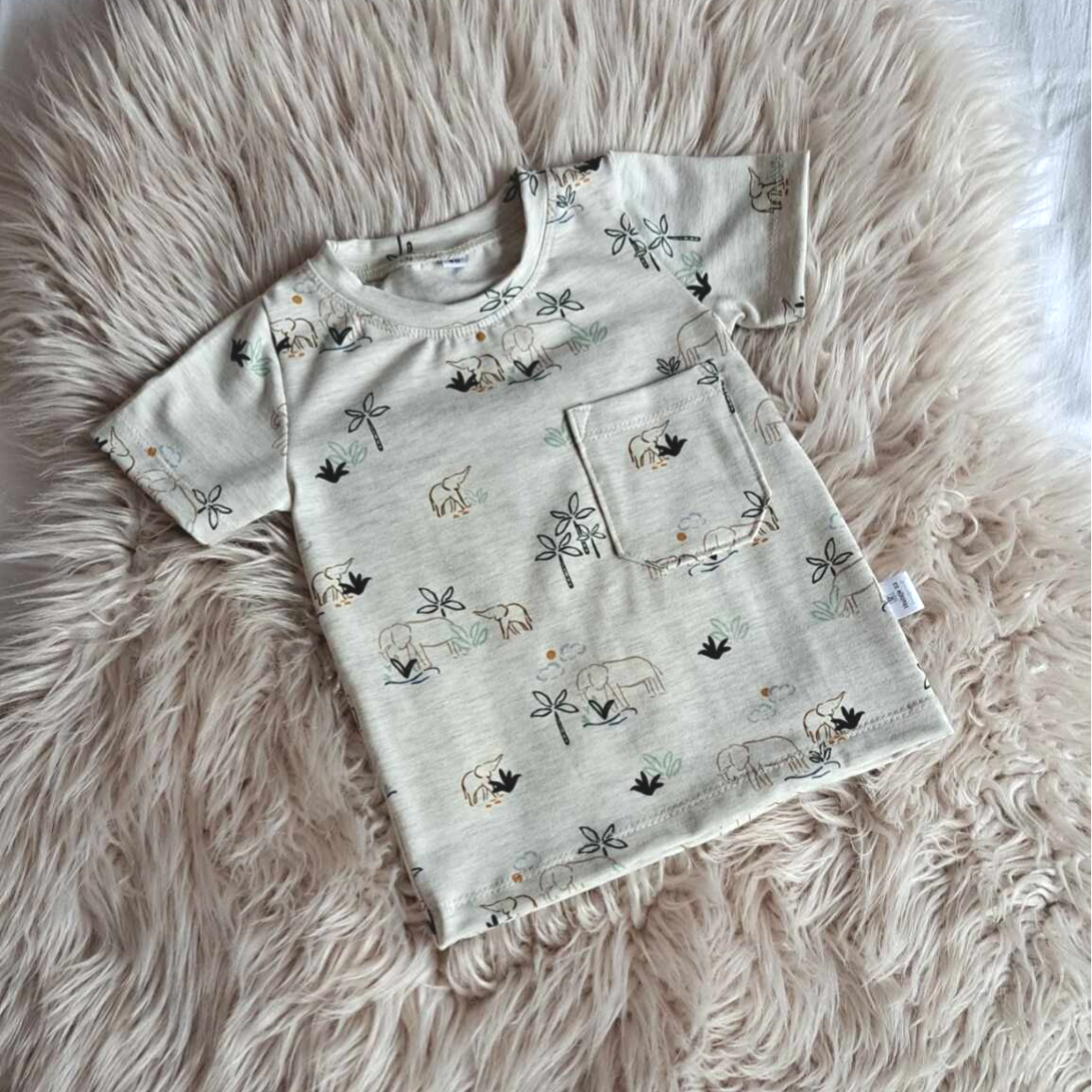 Stoer jongens t shirt met groene achtergrond en olifantjes.