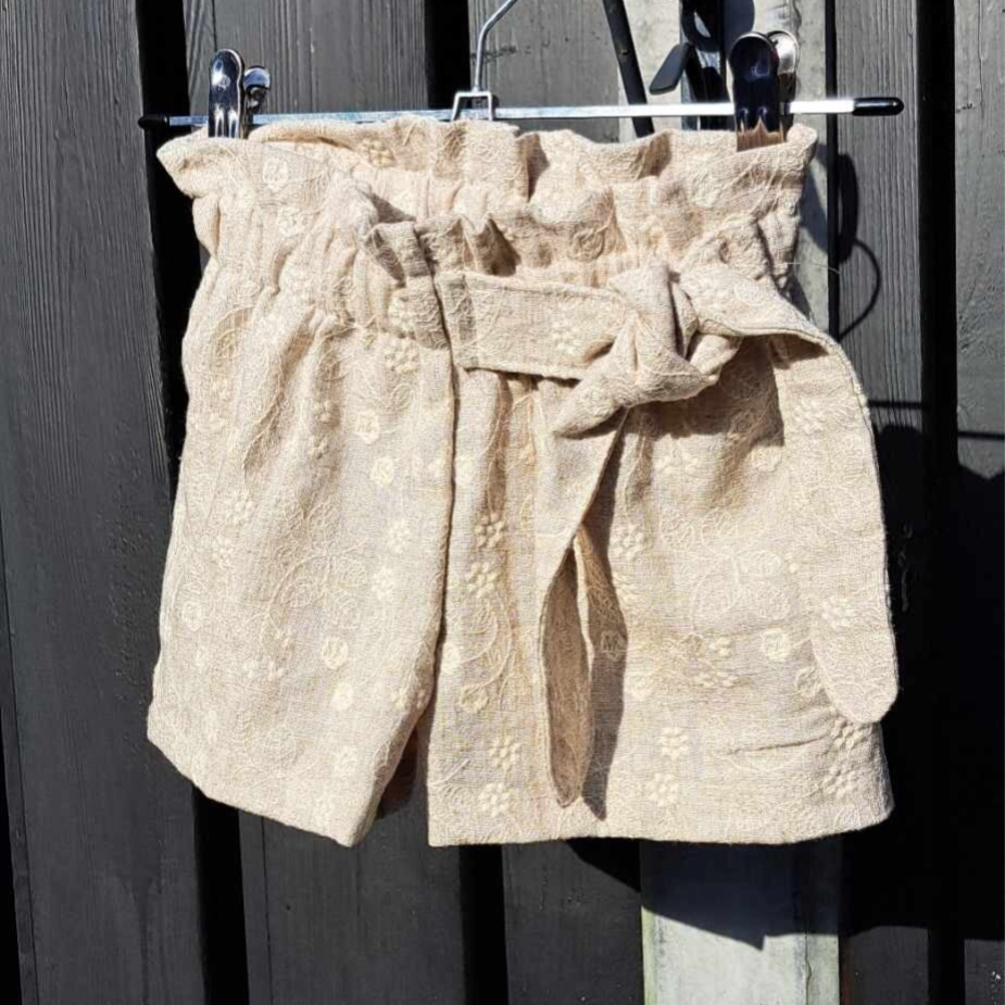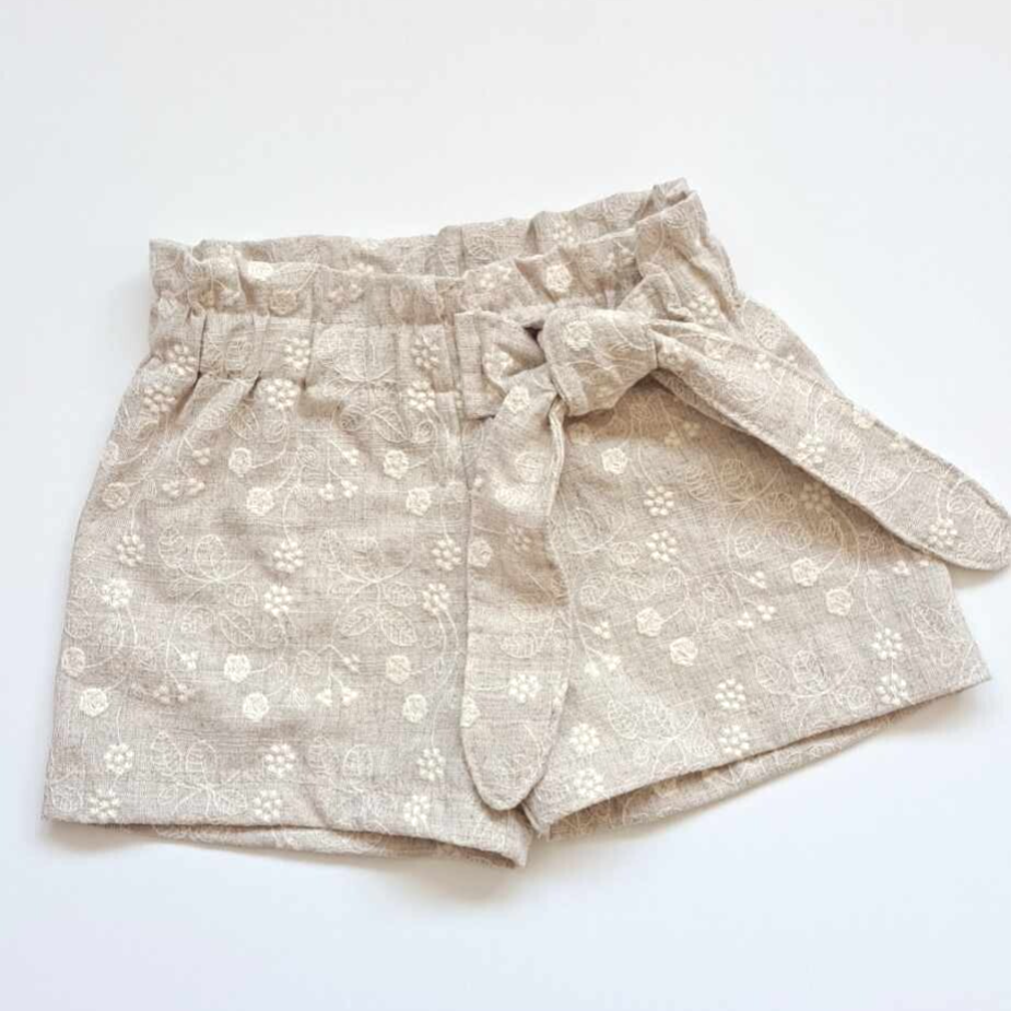 Short van katoen/linnen stof, met strik en en bloemenborduursel